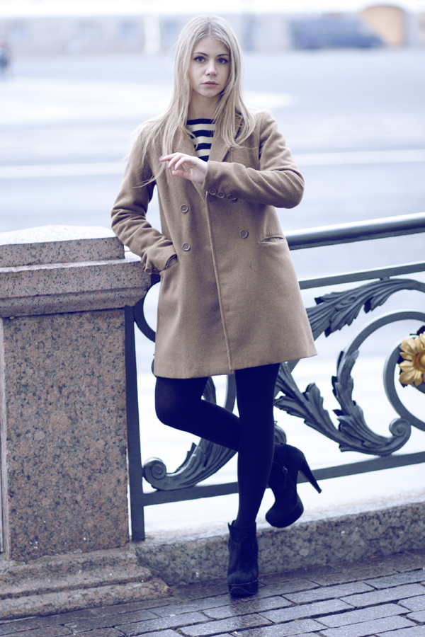Tran: I bought this coat about a year ago, when I was impressed by the simplicity of Celine looks. You can wear it for many seasons and never be afraid that it would be out of fashion. I really love some warm colours like beige, white, brown, so I decided to match it with this Kate Moss for topshop sweater and beige leather skirt. I like how it looks: simple, comfortable to wear and the combination of colours is nice.
